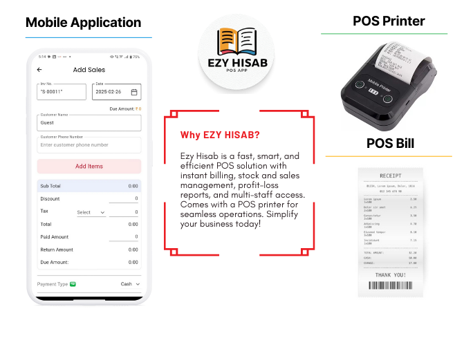 Effortless billing, real-time stock tracking, and complete business management—all in one powerful POS solution. Get Ezy Hisab with a POS printer and streamline your sales today!
